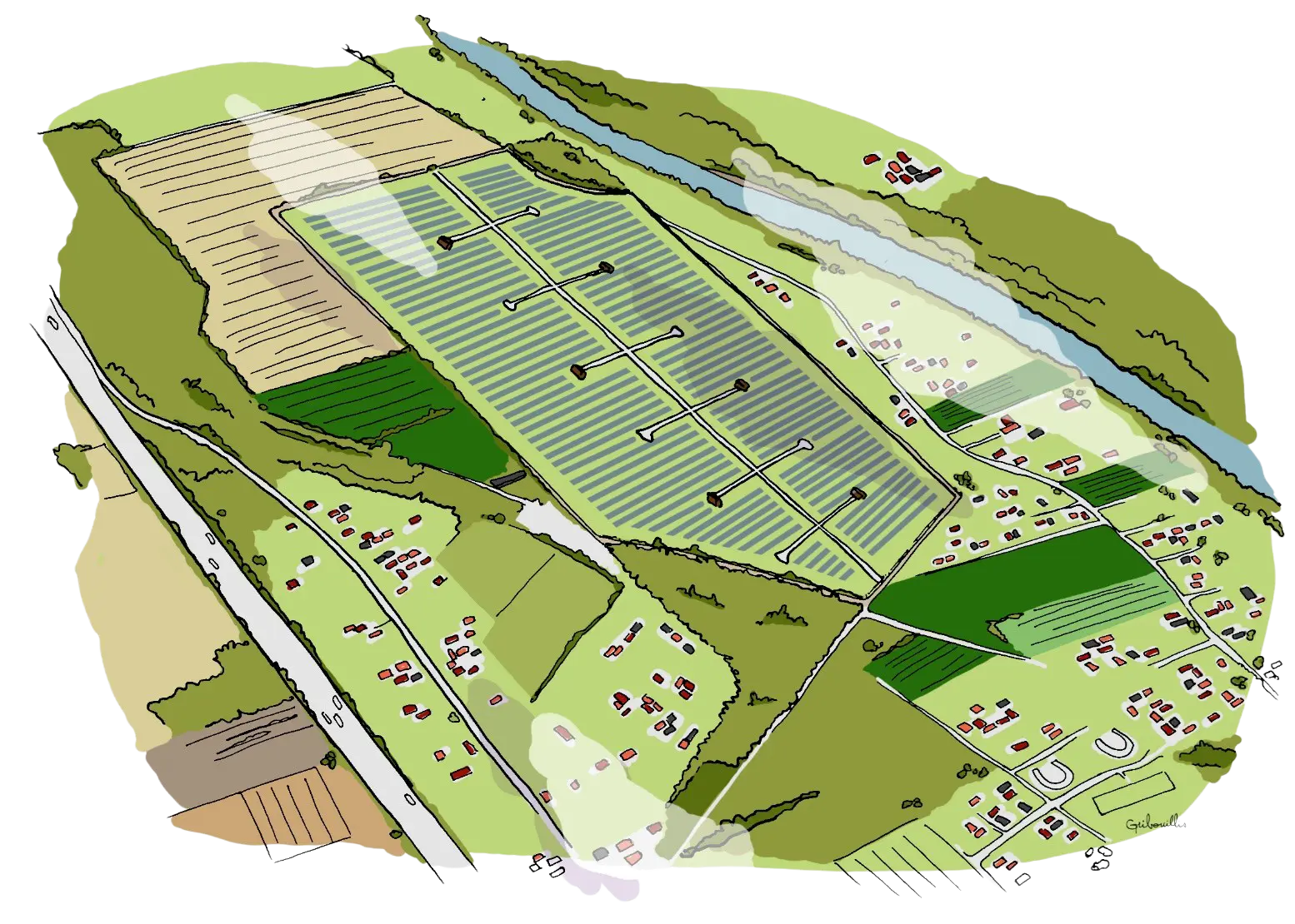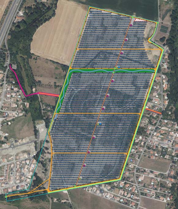Carte du parc solaire du Fauga : en bas à gauche l’espace vert ouvert aux faugatiens, au centre le ruisseau méandré, et en haut à droite la zone de chasse de l’aigle botté.